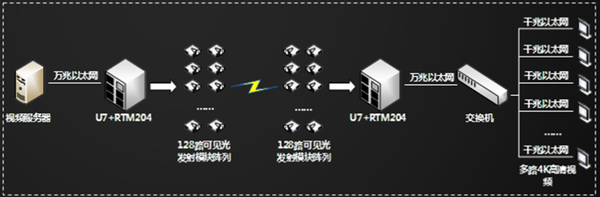 某信息工程大学的“可见光超高速无线互联系统”实现128路视频流可见光传输,实时通信速率达50Gbps。该系统使用定为公司U7和RTM101作为数据传输和信号处理的核心单元,将万兆以太网视频服务器送入的视频流通过128路可见光模块组成的阵列送至以太网交换机,并分发给各个用户。