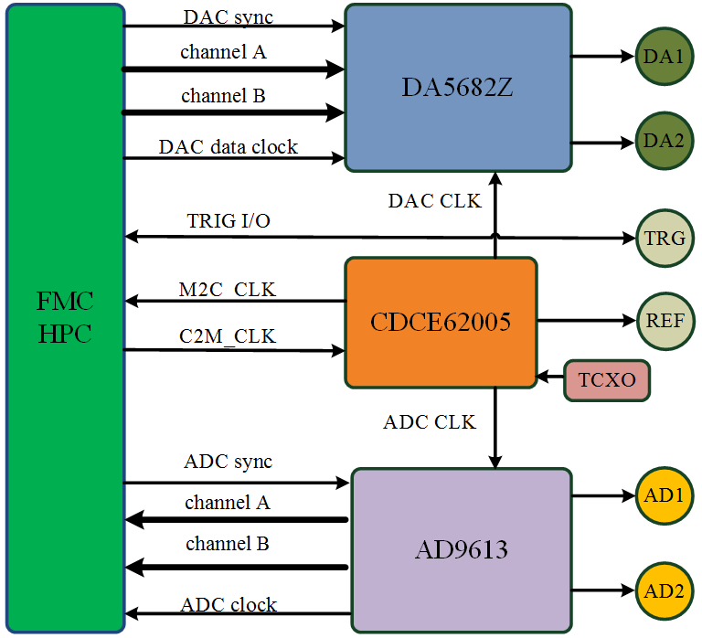 FMC102采用TI的CDCE62005。CDCE62005具有低抖动输出的高性能时钟分配器,内置VCO,提供两路差分输入参考PRI和SEC,板载时钟通过AUX_IN输入;同时能够提供五路独立可编程的差分时钟输出和一路单端输出。