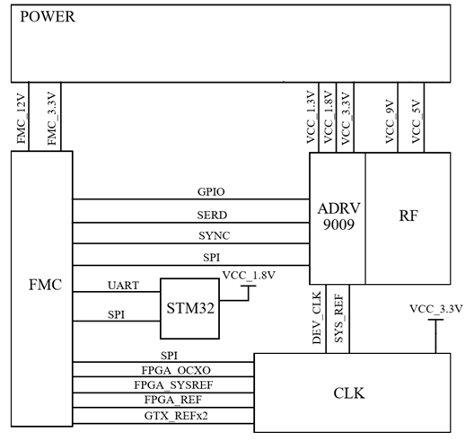 在性能上,FMC207以ADI公司的RF捷变收发器ADRV9009作为处理核心,射频工作频率范围为75 MHz至6000 MHz,涵盖大部分特许执照和免执照蜂窝频段。发射最大带宽450MHz,接收最大带宽200MHz ,提供2路接收2路发射,发射链路添加射频放大器提高线性度,接收链路添加低噪声放大器可有效的降低输入噪声和提高接收机的灵敏度。提供外供参考时钟输入功能。