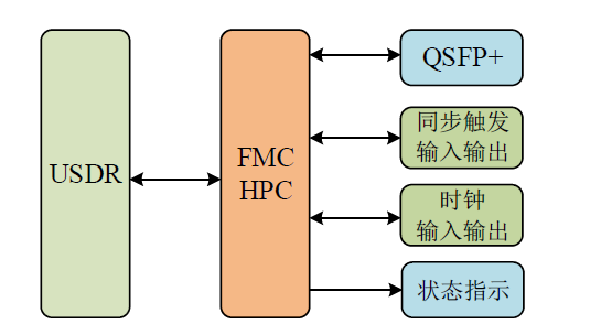 FMC801作为USDR系列端口扩展FMC,具有时钟输入输出功能,支持外部参考时钟输入至USDR主板,支持USDR主板时钟通过FMC801时钟输出端口输出。