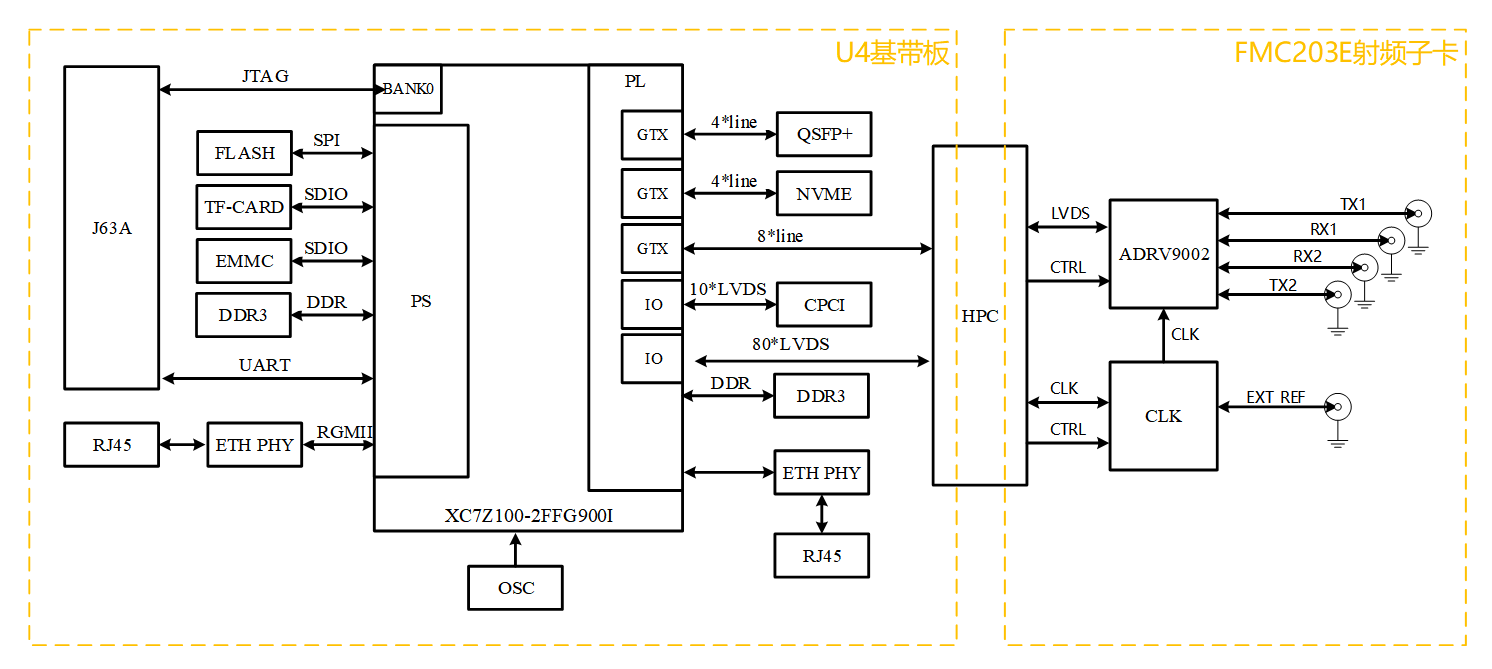 (1) 集成ADRV9002双通道2发2收TDD射频收发芯片;