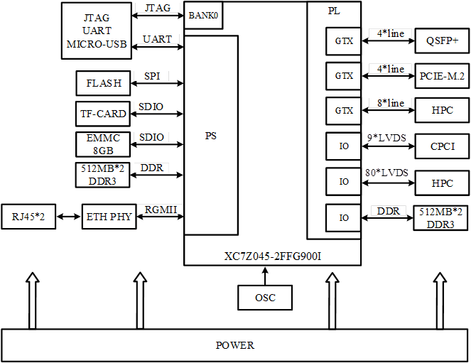 U4平台采用Xilinx推出的XC7Z045作为处理核心,搭载一个HPC FMC扩展插槽,可用于扩展AD/DA、光口、射频等板卡等;平台提供一路QSFP+接口及一个千兆以太网口,可广泛应用于高速采集存储平台、无线通信原型,宽带信号处理终端、远端RRU等场景。